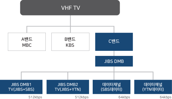 지상파 DMB(T-DMB)는 기존의 TV 방송과 마찬가지로 각각의 방송권역마다 서로 다른 주파수 대역을 사용합니다.